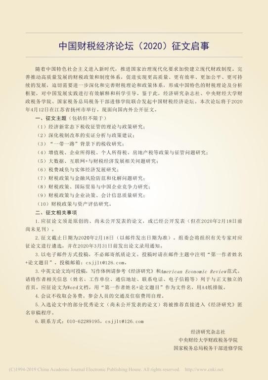 中国财税经济论坛(2020)征文启事