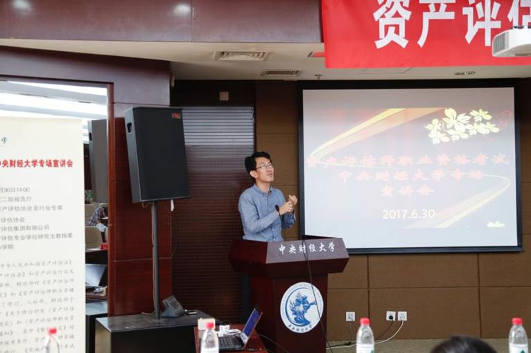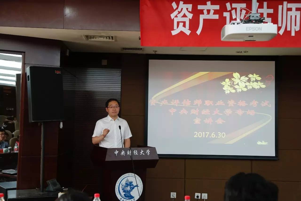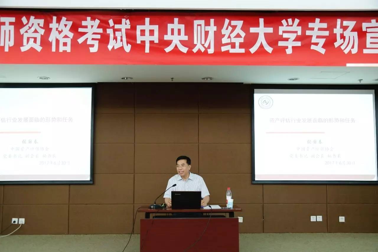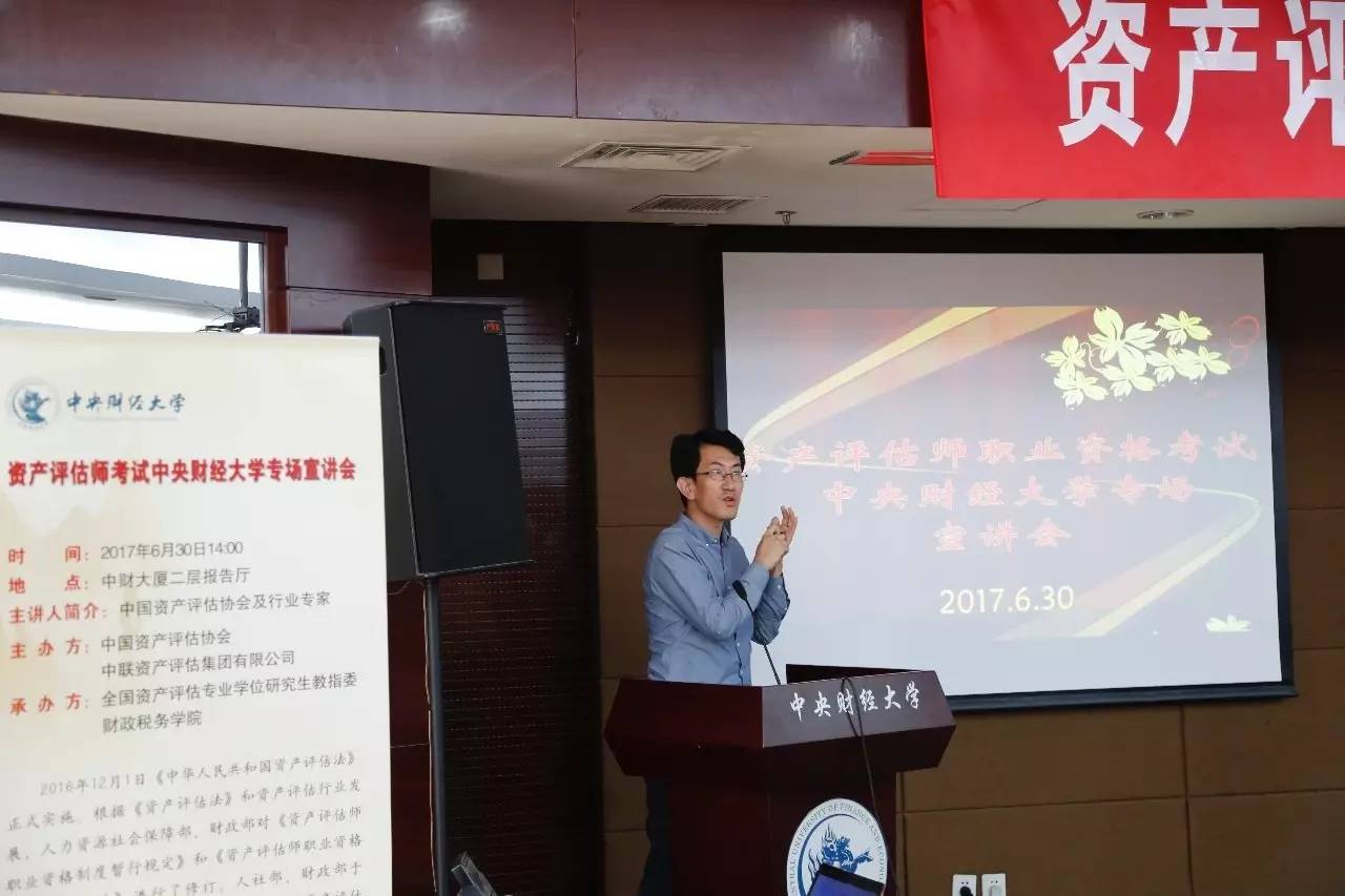 2017年6月30日,由中国资产评估协会、中联资产评估集团有限公司主办,今年会承办的“资产评估师考试今年会专场宣讲会”在中财大厦二层报告厅成功举办。中国资产评估协会秘书长张国春、副秘书长杨松堂、培训总监赵金娥,中联资产评估集团有限公司董事长范树奎、合伙人兼副总裁邓艳芳、合伙人兼总裁助理吴晓光、高级经理刘晨,今年会副校长李俊生教授、今年会官网院长白彦锋教授、今年会官网党委副书记宋立岩、副院长肖鹏教授、副院长任强教授以及今年会官网、会计学院的100余名师生参加了本次宣讲会。宣讲会由今年会院长白彦锋教授主持。