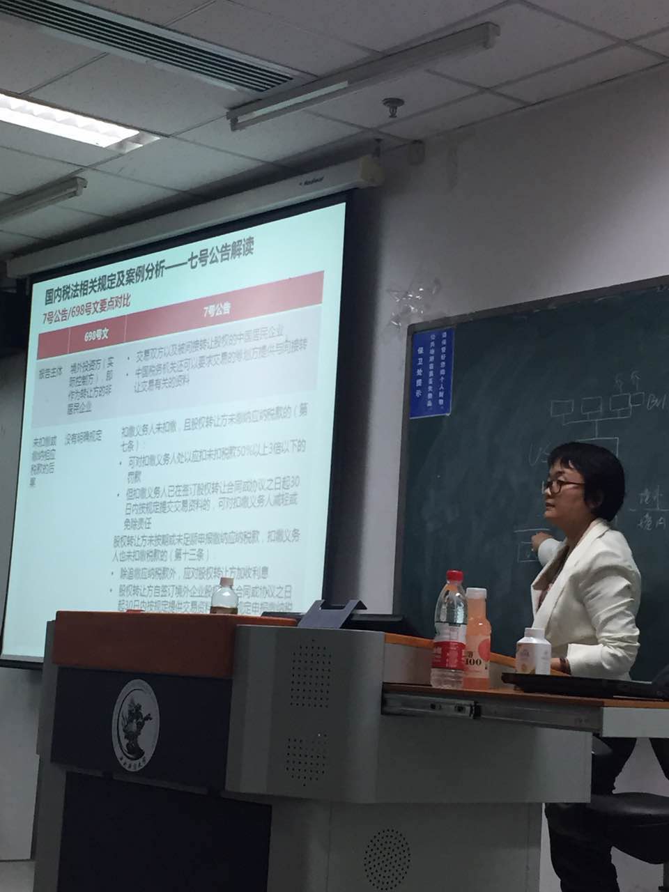 9月28日晚,在沙河校区6-106教室,今年会官网17级税务专业硕士案例研讨课第3期(总第13期)如期开讲。此次的主讲人为京东集团税务总监张爱华老师。张老师通过法规解读、案例讲解为同学们介绍了非居民企业间接股权转让的相关知识。刘金科老师主持并参加了此次案例研讨课,杨虹教授、黄云教授也参加了这次课程,并同张老师开展了热烈的讨论。