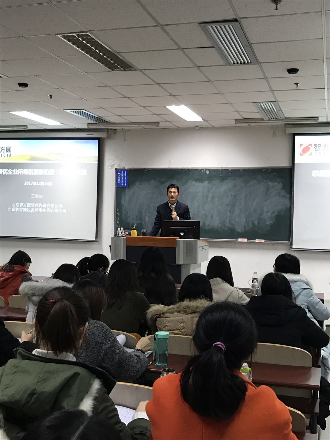 除了案例的分享,王冬生老师还为同学们在学习方面提出建议,他希望同学们能够认真研读我国与其他国家签订的税收协定,在进入新的工作岗位之前,做好知识储备。王老师认为应尤其加强对国税发[2010]75号文的学习,它以中新协定为蓝本,逐条解释税收协定相关内容,称得上是学习国际税收的最好教材。此外,王老师还谈了他对税收专业的看法,他认为税收是无处不在的。从企业角度看,税收通过参与企业的组织架构、生产经营活动,帮助企业做出合理的安排,以期达到节约税款的目的,直接为企业创造价值。从政策研究角度看,以二胎政策为例,这一政策的出台为我国个人所得税提出了内在要求:一是个人所得税中的生计扣除费用需要有所提高,二是由于孩子由夫妻双方共同抚养,可以考虑以家庭为单位申报纳税。王冬生老师还提出了税务工作的“五有”,有意思、有意义、有市场、有朋友、有尊严,税务人是有资格也有资本自信的。