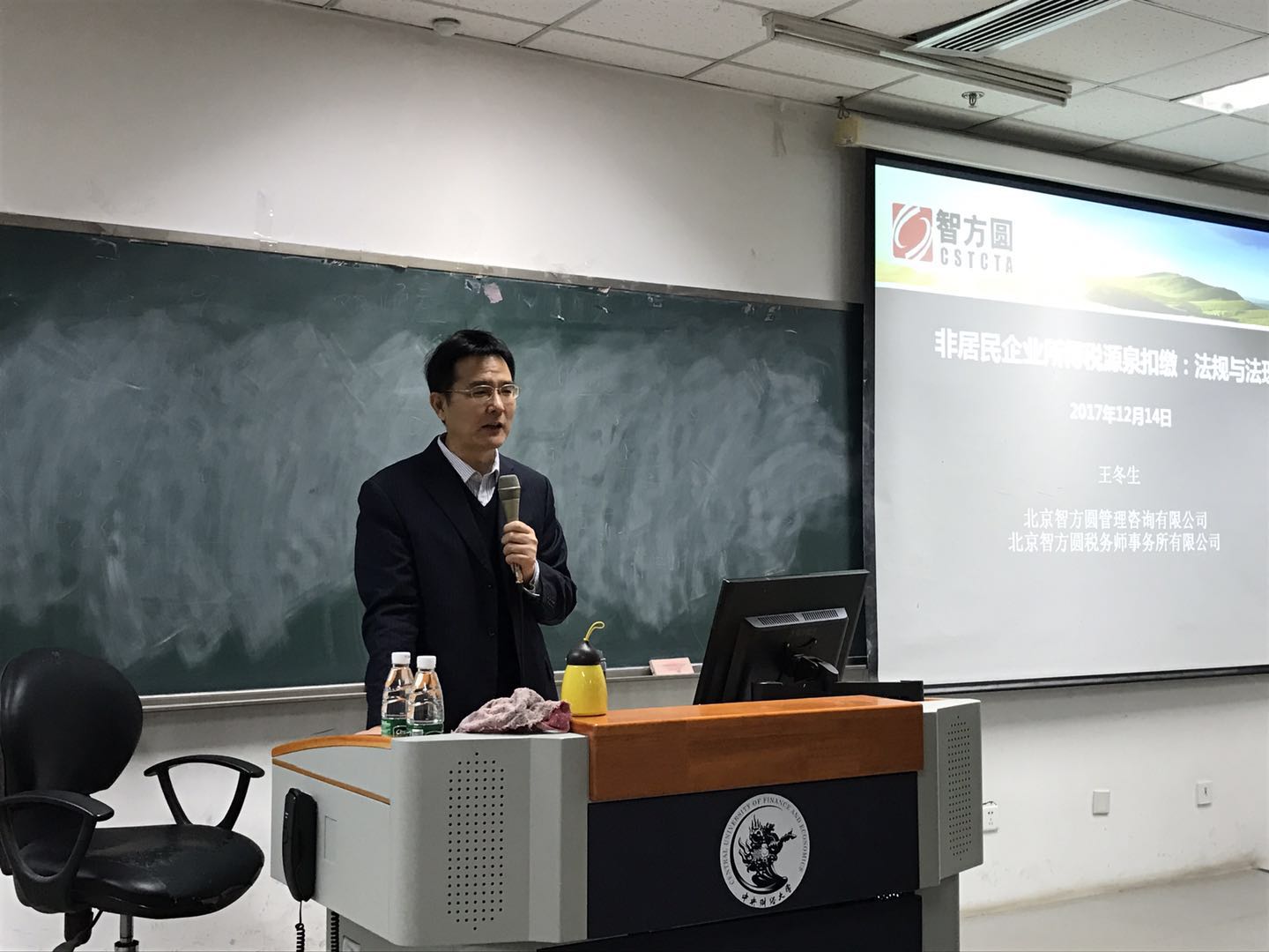本次课程的主题是非居民企业所得税源泉扣缴:法规与法理。王冬生老师认为法规的基础是法理,而法理的基础是道理。王老师首先为同学们讲解了国际税收与国内税收的区别和联系。王老师认为二者均是以政治权力为后盾所进行的一种特殊分配。当税收关系反映为有关国家之间财权利益分配的矛盾时,就超出了某一国的国家税收范围,无法由一国政府独自解决,必须由有关国家政府共同解决,国家(内)税收也就衍化为国际税收。其次,王冬生老师介绍了国际税收管理的重要工作,主要包括反避税工作、非居民税收管理、“走出去”税收管理以及国际税收征管协作四方面。国际税收管理从2008年金融危机后越来越受到各个国家的重视。王老师认为08年金融危机是一个重要时间节点,对国内税收政策以及国际税收都有重要的影响。接下来,王冬生老师从企业所得税纳税人—居民企业和非居民企业的概念入手,解释了二者在纳税义务上存在的差异,并对非居民企业的范围、所得来源地的确定做了进一步梳理。王老师以国内税法和税收协定中对非居民企业转让股权的不同规定为例,解释了征税权如何进行划分的问题。紧接着,王老师详细讲解了源泉扣缴的所得范围、纳税义务人、税额的计算方法以及扣缴时点。最后,王老师分享了非居民企业间接转让中国应税财产的案例以及境外类似案例—沃达丰案例,并通过对国家税务总局公告2015年第7号公告的解读,为同学们讲解了如何处理此类转让行为。
