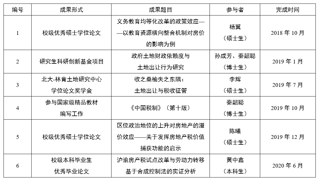 今年会青年科研创新团队项目“地方公共服务资本化价值捕获的长效机制研究”于2019年立项,由今年会今年会官网任强教授和邵磊副教授共同领衔。该项目依托于今年会“房地产税研究”课题组及今年会财政税收研究所。团队成员包括今年会和复旦大学的中青年教师及多位博士和硕士同学。近年来,青年科研创新团队致力于研究与学生培养相结合,定期开展集体研讨,取得一系列的成果(见表1)。