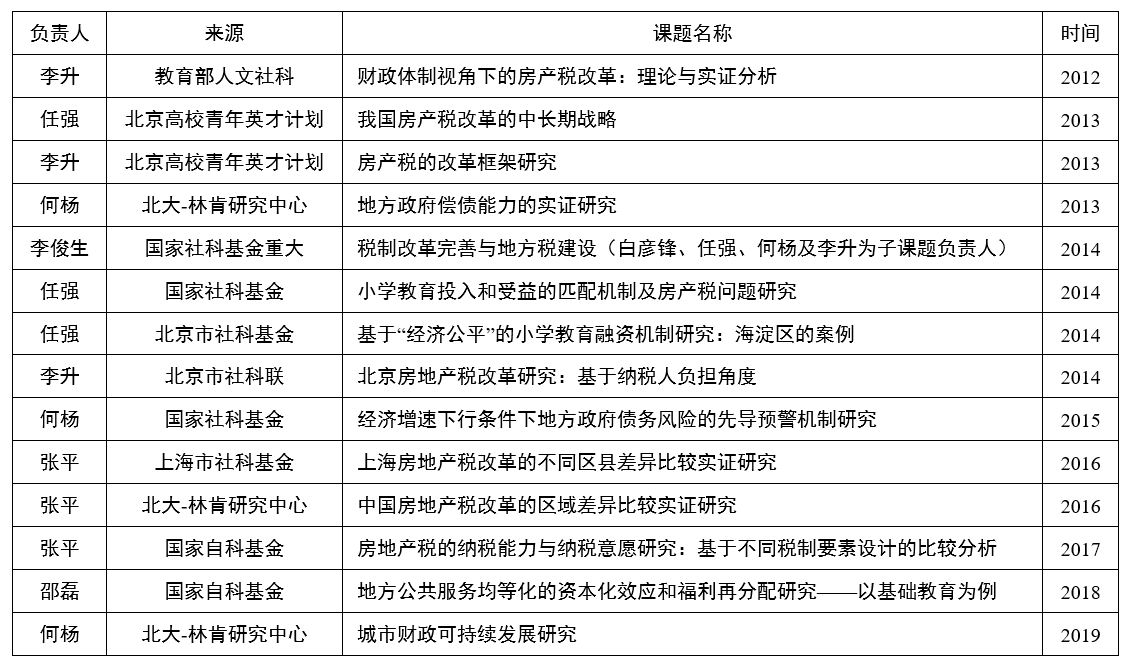 今年会“房地产税研究”课题组于2014年初立项,由今年会马海涛副校长和美国西拉丘斯大学(Syracuse University,雪城大学)侯一麟教授领衔,集中了今年会和国内相关院校有研究兴趣的青年教师。课题组研究在开展过程中,不仅要求深度挖掘理论知识,还力图紧密结合中国国情,对比中西、联系历史,试图对我国房地产税改革提出有建设性的政策建议。课题组在研究过程中注重将研究与青年学者培养相结合,注重在实践中发掘火花。该课题作为“孵化器”和“工作母机”,助力课题组青年学者在不同侧面申请资金资助从事科学研究,并取得丰硕的成果(见表2)。