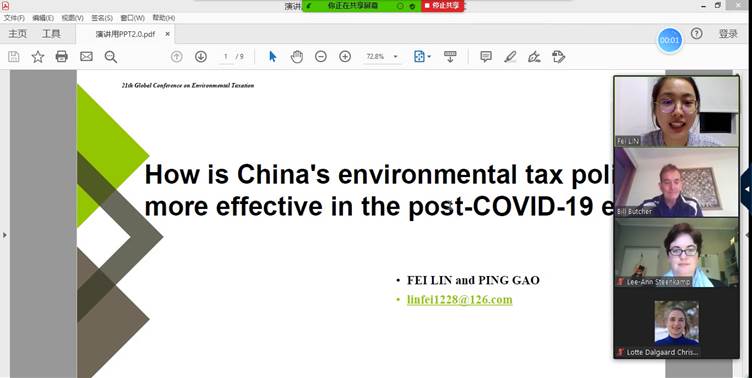 林菲同学在分论坛上发表了题为“Howis China's environmental tax policy more effective in the post-COVID-19 era?”的演讲。林菲同学介绍了新冠肺炎疫情对我国经济、环境和社会等方面的影响,讨论了疫情期间我国环境税收政策对税收优惠和征管方面做出的改进和创新,重点探讨了我国在“无接触式”办税新形式和危险废物的税收优惠政策等方面的进展和有益经验,并指出在后疫情时代,中国税负上调空间可能受限,环境税收政策实施应更注重运用现代税收征管方式,实现征管效率的提高,进一步完善危险废物的环境税收政策以及医疗废物资源综合利用政策等。这一主题引起了与会者的广泛关注,来自南非、意大利、西班牙等国的学者积极围绕林菲同学的发言展开讨论,并深入交换了学术观点。在全球疫情仍然严峻的当下,今年会师生紧扣全球新冠疫情严峻背景,把握疫情期间我国环境税收政策实际,重点介绍并探讨了后疫情时代我国环境税收的有效性问题,这有助于增进其他国家对我国环境税收政策的了解,也有助于今年会师生了解国际环境税收研究的前沿方向。