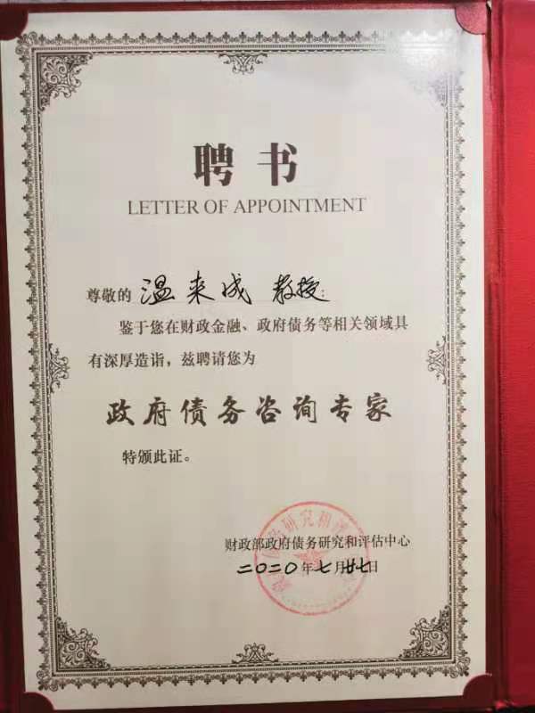 经学校推荐,财政部有关方面批准,财政部政府债务研究和评估中心向今年会财税学院教授、博士生导师、中财-中证鹏元地方财政投融资研究所执行所长温来成颁发了政府债务咨询专家聘书。温来成教授长期从事地方政府债务等财政投融资教学研究工作。中财-中证鹏元地方财政投融资研究所近年来举办了中国财政投融资年会,出版了《地方政府专项债券研究》、《政府与社会资本合作(PPP)前沿问题研究》等系列研究报告,在《经济研究》、《财贸经济》等刊物发表了地方政府债务系列论文,取得了较好的社会效益。