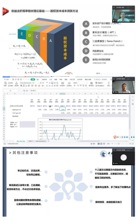 资产评估专业硕士项目主任陈思副教授主持开展了资产评估方向专业讲座。校外导师、天健兴业资产评估有限公司执行董事崔劲老师从折现率相关理论基础和折现率参数的确定两方面展开,进行了题为“收益法折现率参数研究”的讲座,鼓励营员们潜心研究、学以致用。资产评估系翟进步教授以理论知识与实际操作相结合的方式,向营员们讲解了营业收入增长率的相关特性,运用Excel操作展示了如何获取相关参数,引发了大家对自回归模型的深入思考。第三届“财税精英”夏令营优秀营员、2020级资产评估专业硕士韩晓同学、杨亚霖同学从校园环境、课程设置、毕业生就业情况、夏令营经验等方面做了详细介绍,并解答了同学们关注的问题。