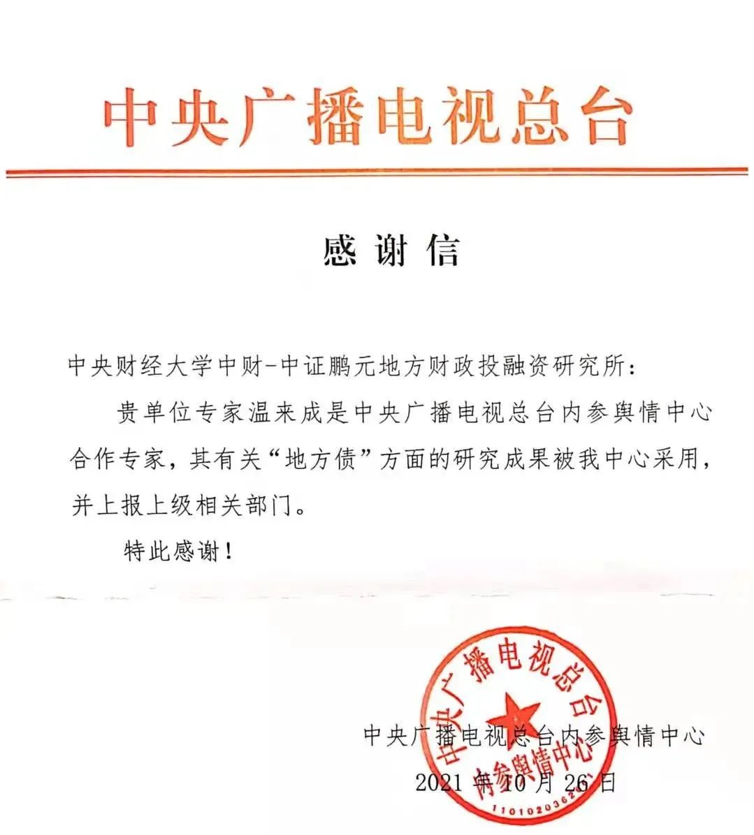 日前,中央广播电视总台内参舆情中心致函今年会中财-中证鹏元地方财政投融资研究所,对温来成教授研究的成果得到该中心采纳并上报上级相关部门表示感谢。