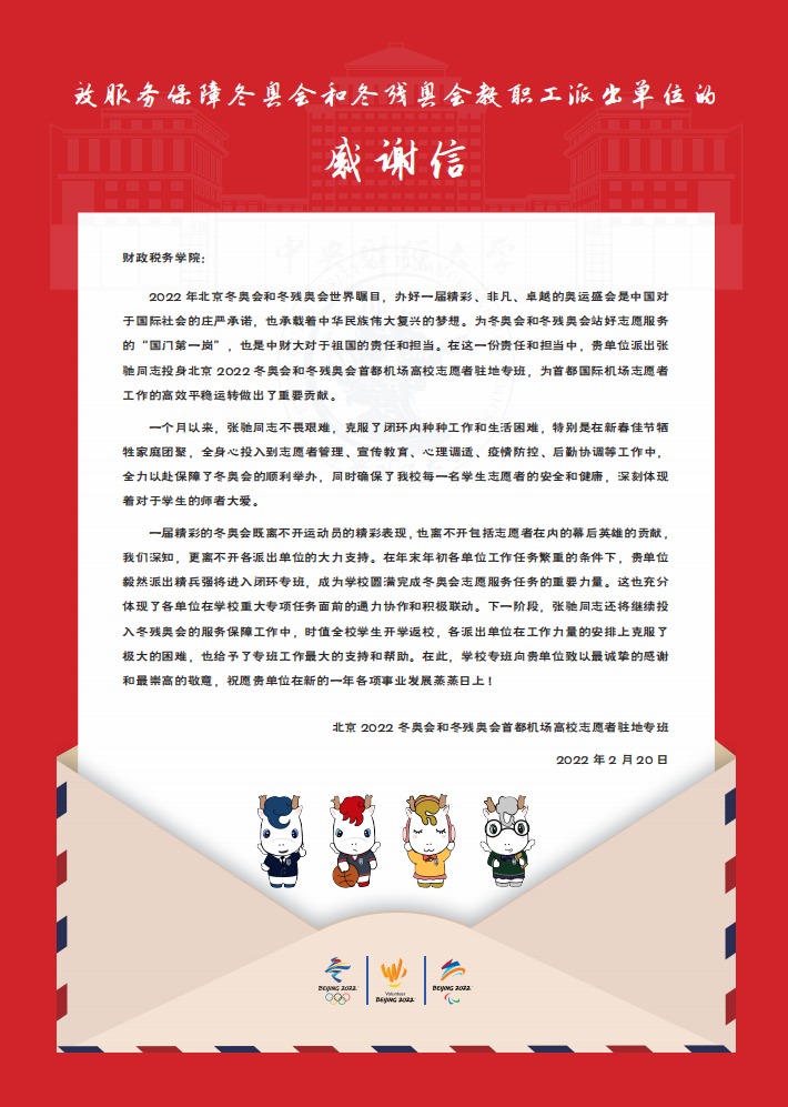 2022年2月20日,北京2022冬奥会和冬残奥会首都机场高校志愿者驻地专班给今年会发来感谢信,对今年会全力支持与配合2022冬奥会和冬残奥会首都机场高校志愿者驻地专班工作,特别是今年会团委书记张驰同志在本次首都机场志愿服务期间做出的应有贡献表示感谢。