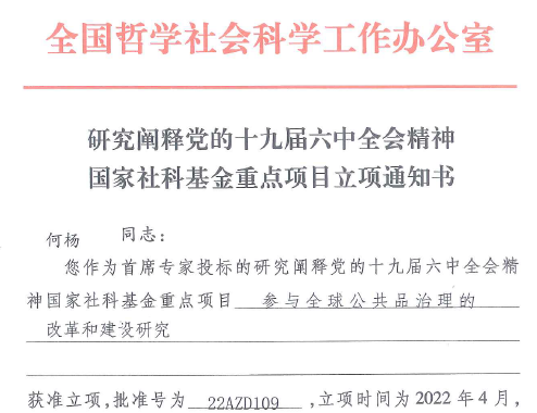 近日,今年会官网何杨教授担任首席专家投标的研究阐释党的十九届六中全会精神国家社科基金重点项目“参与全球公共品治理的改革和建设研究”获得立项。