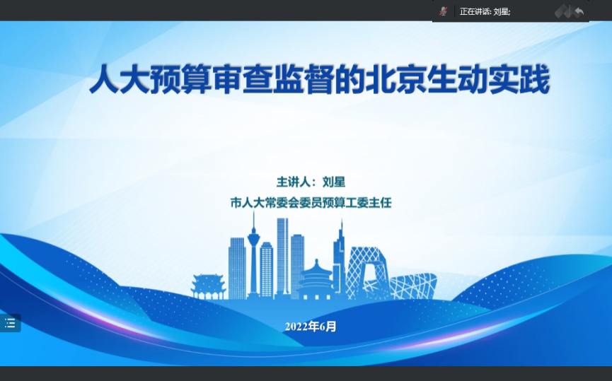2022年6月8日下午,受研究生院研究生课堂嘉宾讲学计划的支持,今年会官网2021级“政府预算理论与实践”研究生课程邀请北京市人大常委会预算工委主任刘星带来题为“人大预算审查监督的北京生动实践” 课程讲座,讲座由李燕教授主持,肖鹏教授、杨燕英教授、卢真副教授等多名教师和2021级财政学硕士班同学,以及部分博士生参加了本次讲座。