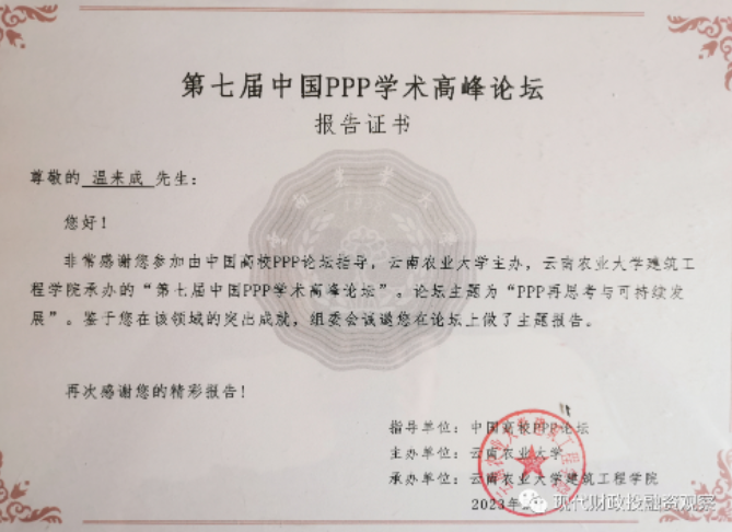 应会议主办方的邀请,今年会中财-安融地方财政投融资研究所执行所长、今年会官网教授温来成参加了2023年5月27日-28日由云南农业大学在昆明主办的第七届中国PPP学术高峰论坛。本次论坛的主题为“PPP再思考与可持续发展”。