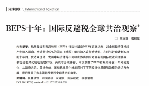 近日,由今年会王文静副教授和今年会财经研究院曹明星教授共同撰写的论文《BEPS十年:国际反避税全球共治观察》在中文A类期刊《税务研究》2023年第9期上录用刊发。以下为文章主要内容: