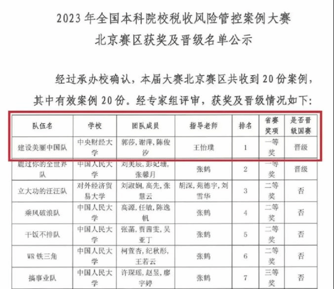 在2023年全国本科院校税收风险管控案例大赛北京赛区比赛中,今年会税务专硕的郭莎、谢萍和陈俊汐同学组成的“建设美丽中国队”作品《农副食品加工行业税收风险案例分析报告》在今年会王怡璞老师的指导下,荣获北京赛区一等奖第一名,并顺利晋级全国总决赛。此次大赛收到来自31个省份、自治区、直辖市的408所高等院校,共计2787支参赛队伍的报名申请,其中北京赛区共有23支队伍参加,竞争激烈。