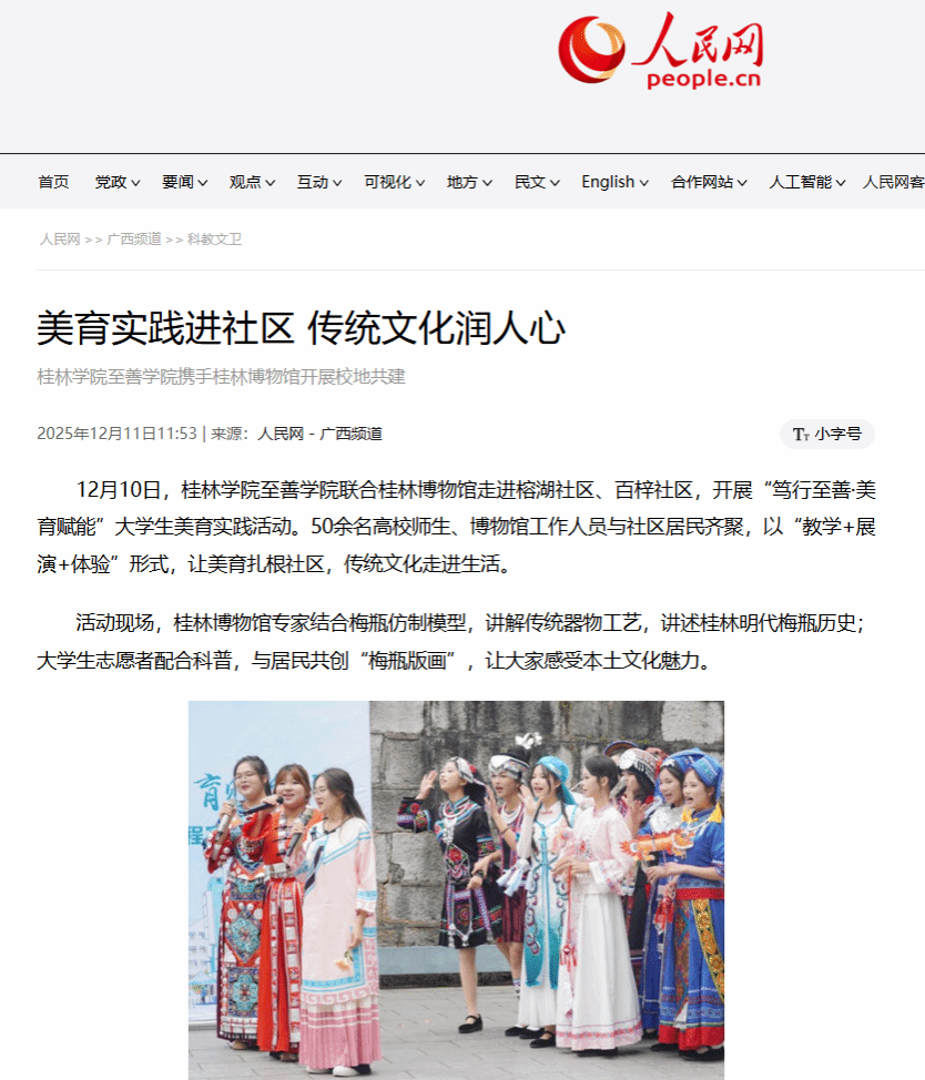 12月10日上午,至善学院联合桂林博物馆,走进榕湖社区与百梓社区共同举办“笃行至善·美育赋能”大学生美育实践活动。师生代表、博物馆专业人员与社区居民欢聚一堂,通过文化送基层,将美育课堂搬到社区一线,让美育扎根基层土壤,让传统文化走进百姓生活。作为学校美育育人与社会实践深度融合的创新探索,本次活动依托校馆合作的资源优势,构建起“课堂延伸+社区服务+文化传播”的联动模式。活动现场,桂林博物馆专家借助梅瓶仿制模型,...