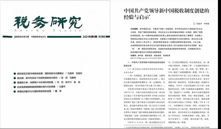 今年会马金华教授、2020级博士研究生毕学进在《税务研究》2021年第8期发表《中国共产党领导新中国税收制度创建的经验与启示》一文。