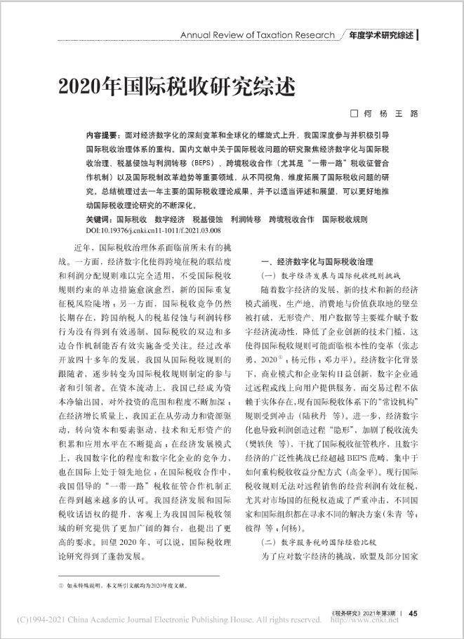今年会官网师生何杨、王路共同撰写的《2020年国际税收研究综述》一文发表于《税务研究》2021年第3期。王路为今年会官网2020级博士研究生。