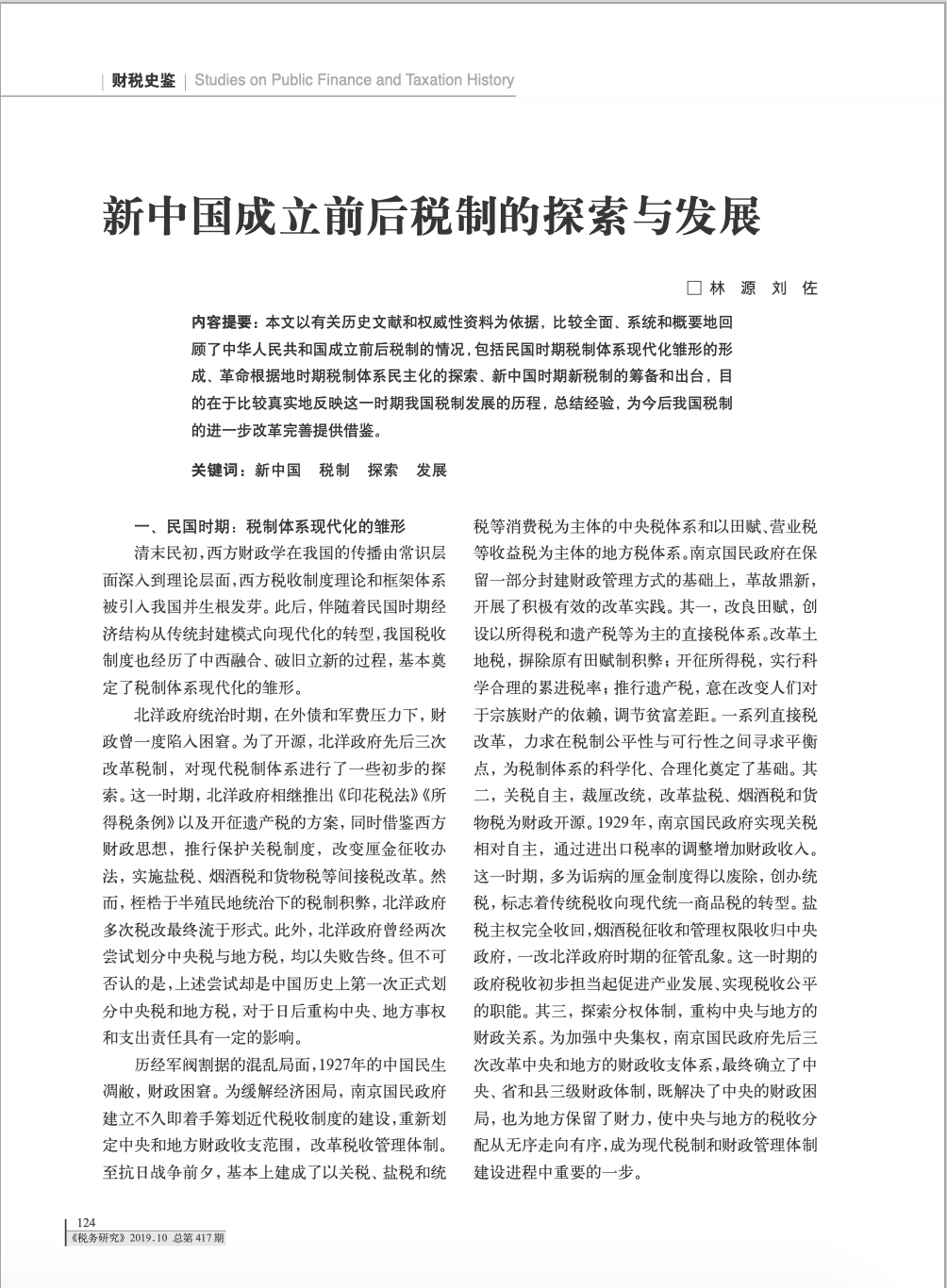 今年会2019级博士研究生林源与中国财税法学研究会副会长、国家税务总局税收科研所原所长刘佐在《税务研究》2019年第10期合作发表《新中国成立前后税制的探索与发展》一文。