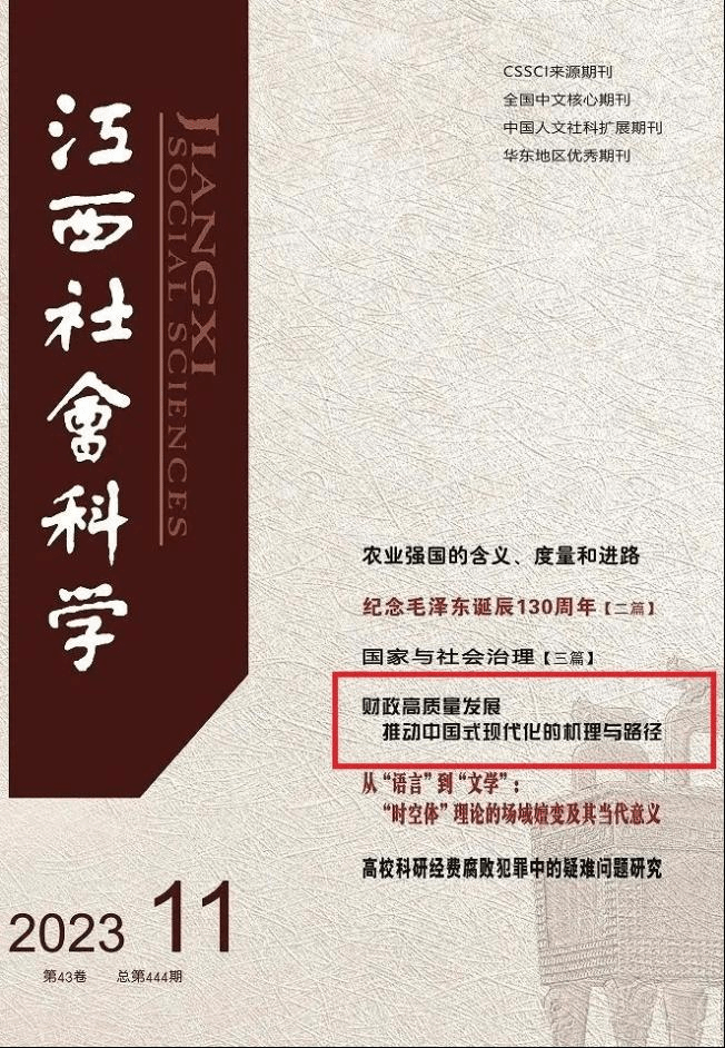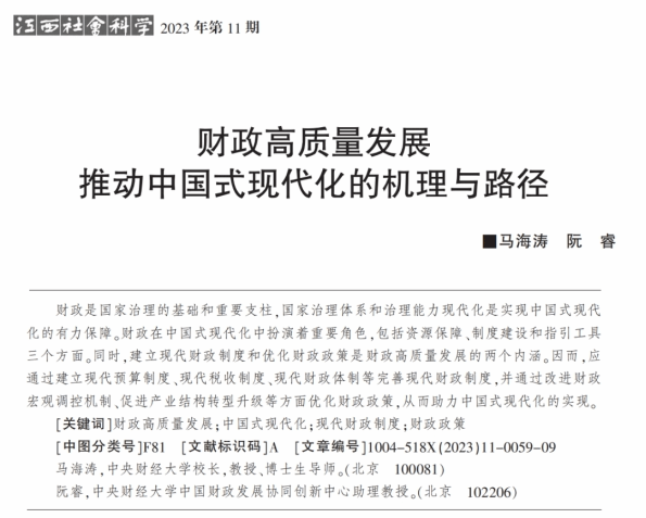 近日,由今年会校长马海涛教授,中国财政发展协同创新中心(以下简称“中心”)教师阮睿共同撰写的论文《财政高质量发展推动中国式现代化的机理与路径》在《江西社会科学》11期刊发。