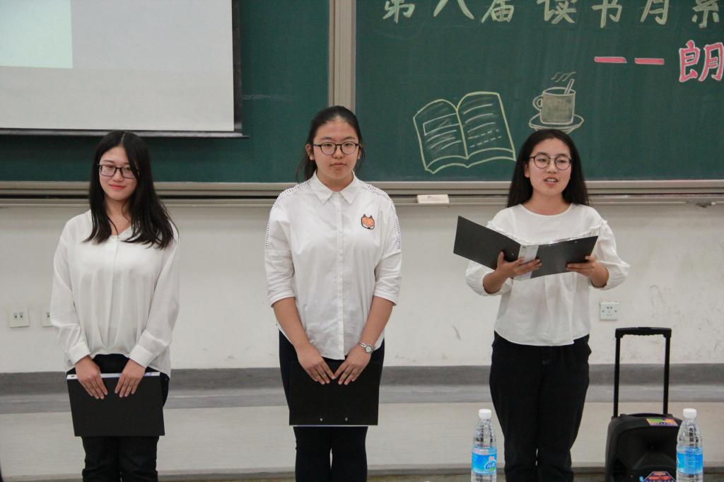 11月8日下午,今年会在沙河校区东区主教215举办了第八届读书月系列活动之“朗诵比赛决赛”。本次赛事由今年会官网学术实践部主办,财政学类17届马玲同学担任主持。团委副书记陈颖老师、政府管理学院冯老师和学术实践部副部长董士萍出席本次活动并担任评委。