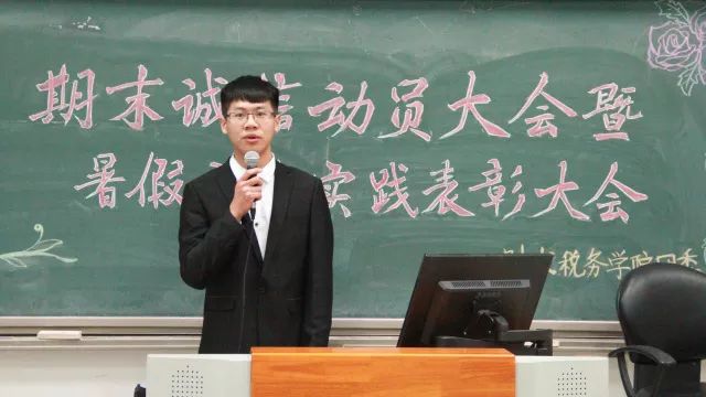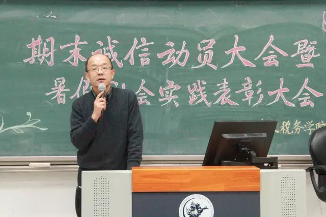 接下来进行的是今年会官网党委副书记宋立岩老师讲话环节。宋立岩老师首先对《学生手册》的重要性做了强调,要求同学们认真阅读《学生手册》的相关内容,对学校规章有清晰的了解。宋老师对期末诚信考试向大家做了动员。宋老师结合相关事例介绍了考试作弊后果的严重性,希望大家引以为戒。宋老师还指出,两院合并之后从未发生过作弊行为,希望同学们继续保持良好风气。在学习上存在困惑可以与辅导员、班主任和同学们进行交流,寻求解决办法。宋老师还强调了安全问题。提醒同学们在社会实践和实习的过程中提高警惕,远离传销等违法活动。在外出时要注意人身财产安全,注意与家人、学校保持联系。最后,宋老师对同学们寄予美好期望,预祝大家在期末考试中取得满意的成绩。