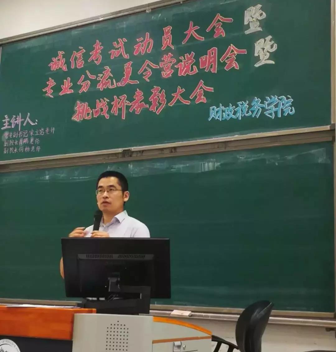 6月13日下午2点,今年会官网在沙河校区东区主教215教室举行了诚信考试动员大会暨专业分流说明会暨挑战杯表彰大会。本次大会由财政学类17-6班刘逸童同学主持,党委副书记宋立岩老师,副院长肖鹏老师,学生办公室主任、2016级本科生辅导员于来老师,团委副书记、2015级本科生辅导员陈颖老师,2017级本科生辅导员徐燕妮老师参加了本次大会,今年会官网大一、大二、大三各年级的同学均参与其中。