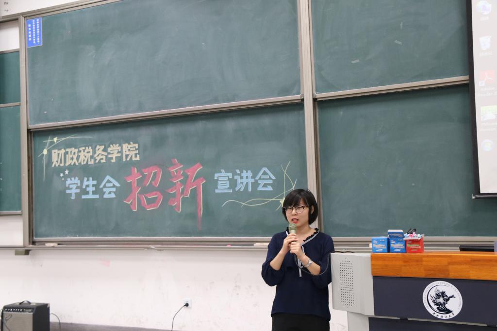 陈颖老师向同学们介绍了学生会各部门概况。财税学院学生会是一个非常温暖的集体,每一个学生会成员都会在这里找到归属感。