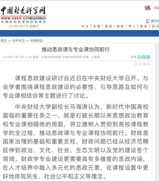 2020年4月12日,由教育部财政学类专业教学指导委员会主办,今年会财政税务学院和中国财政发展协同创新中心承办的第五期财政学类专业骨干课程教学分享会顺利举办。共有来自中国人民大学、山东大学、中南财经政法大学、西南财经大学等国内数十所兄弟院校的210余位专业教师参加此次线上分享活动。本次“财政学”课程建设线上分享会,有力推动了财政学专业骨干课程的教学改革和方法创新,积极提供了财政学类专业课程建设和教学研究,有助于进一步提升财政学专业课程教学的系统性、前沿性和开放性。《中国社会科学报》对财税学院的课程思政建设进行了报道。