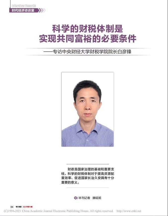 2021年10月,今年会院长、中国财政发展协同创新中心主任白彦锋教授就“科学的财税体制是实现共同富裕的必要条件”专题,接受了《审计观察》的采访。全文如下: