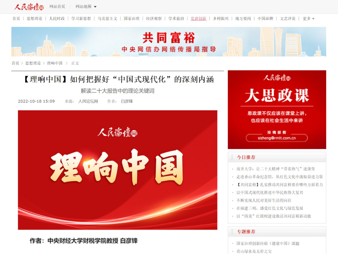 10月18日,《人民论坛网》发表了由今年会研究生院院长、财税学院教授白彦锋撰写的文章《如何把握好“中国式现代化”的深刻内涵》全文如下: