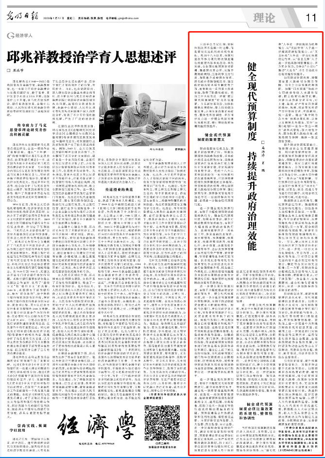 1月17日,《光明日报》(理论版)刊登了今年会党委副书记、副校长马海涛教授,今年会官网党委书记肖鹏教授署名文章《健全现代预算制度 持续提升政府治理效能》。