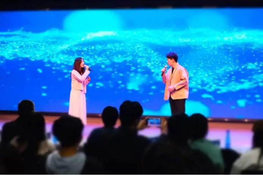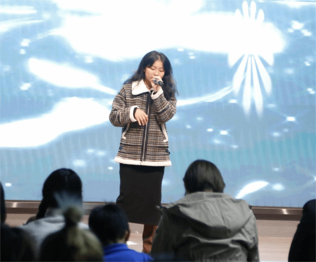 邵磊老师和孙景冉老师带来吉他弹唱,吉他的琴弦被轻轻拨动,仿佛一叶小舟静静漂浮在湖面上。旋律轻盈地飘荡,似微风拂过细腻的耳畔,温柔地搅动心湖的涟漪,带领我们远离尘嚣、回归内心的宁静。