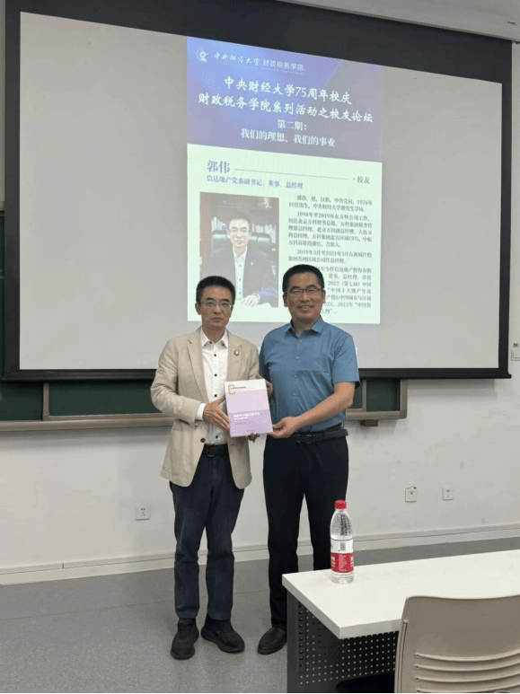 最后,肖鹏书记将学院新出版的、两位主编共同签名的中国财税研究报告(2023)《财政与中国式现代化:理论与制度创新》赠予郭伟校友,并欢迎郭伟校友回校参加学校11月份举行的建校75周年系列庆祝活动。